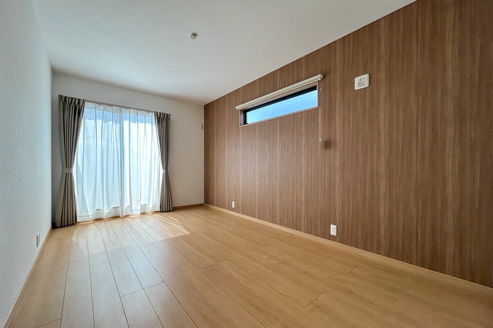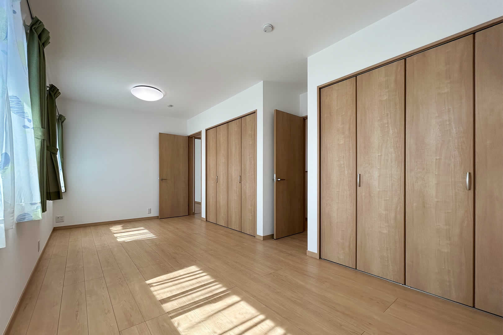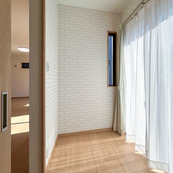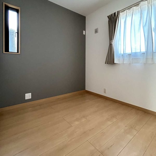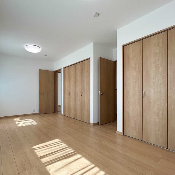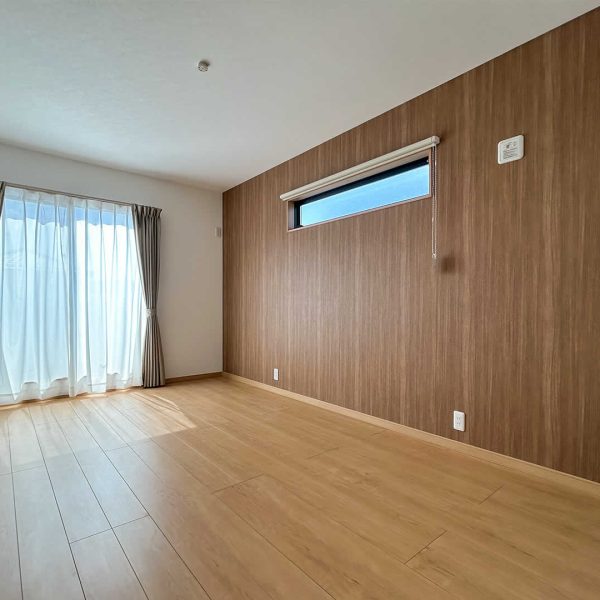 木目のクロスが暖かみのある寝室は趣味室を隣接しています。お子さまが小さいうちは大きなベッドを並べても余裕のある広さです。