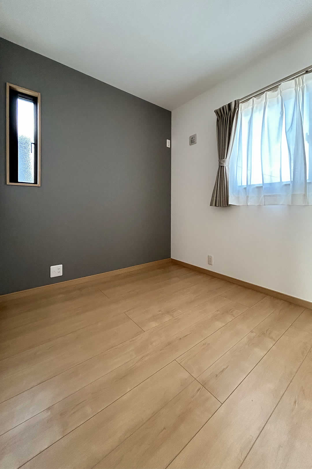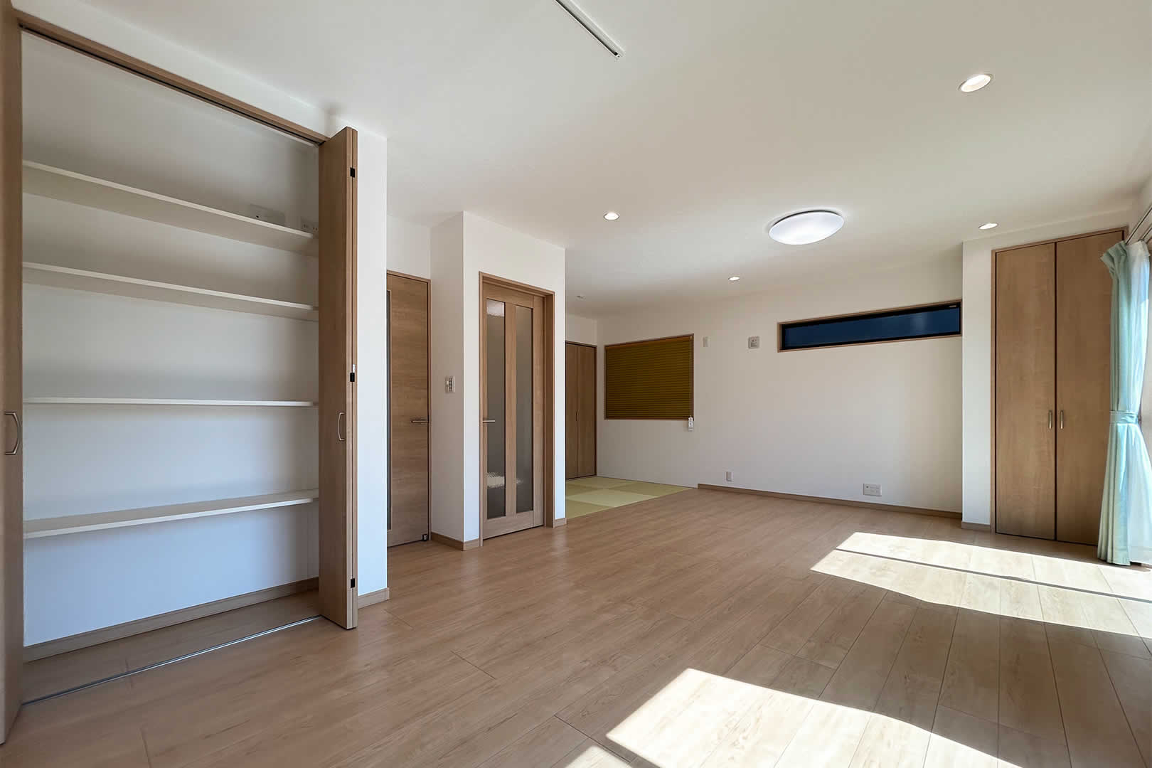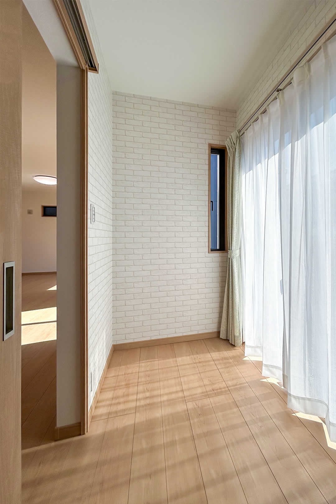 木目のクロスが暖かみのある寝室は趣味室を隣接しています。お子さまが小さいうちは大きなベッドを並べても余裕のある広さです。