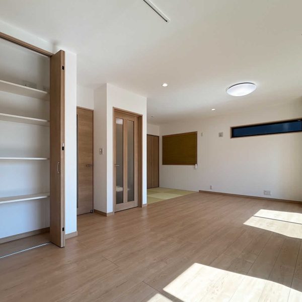 広々としたリビングには畳スペースを作りました。お子さまが小さいうちは特に畳でお昼寝ができたりとても便利です。あえて扉で仕切らず一体感のある間取りにしました。