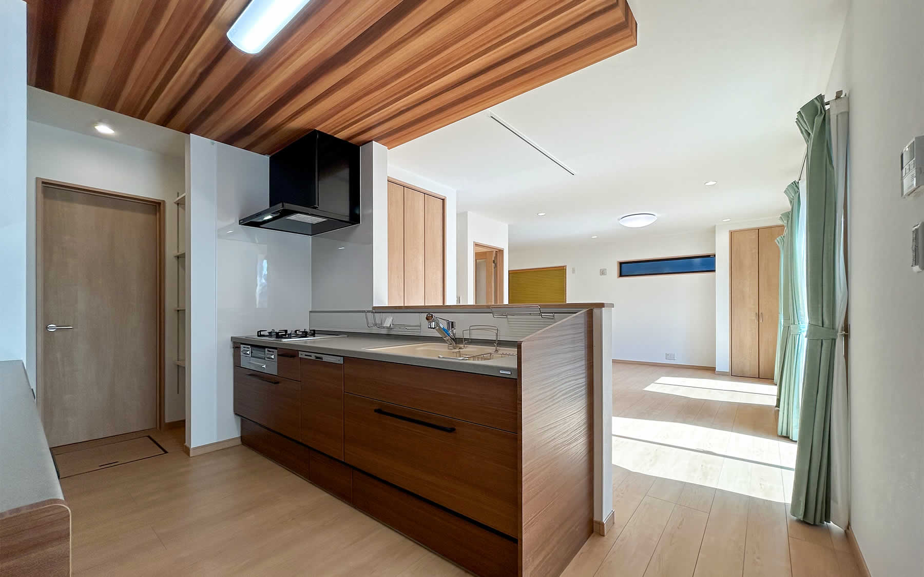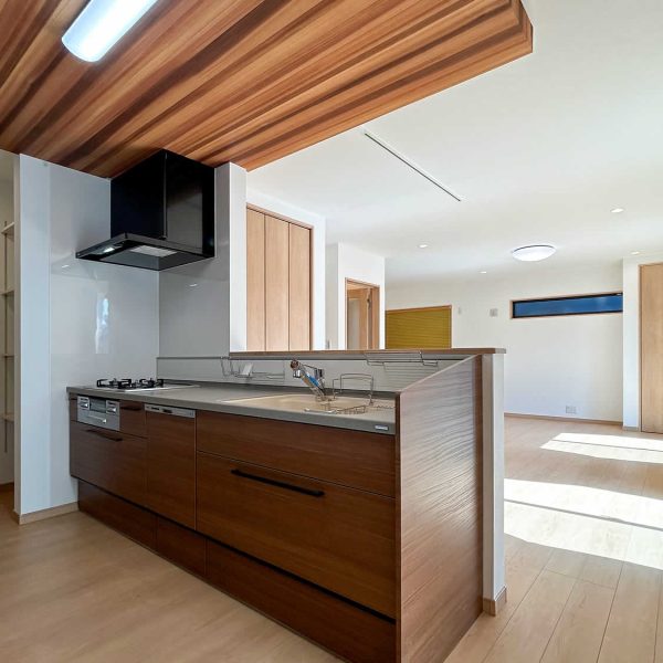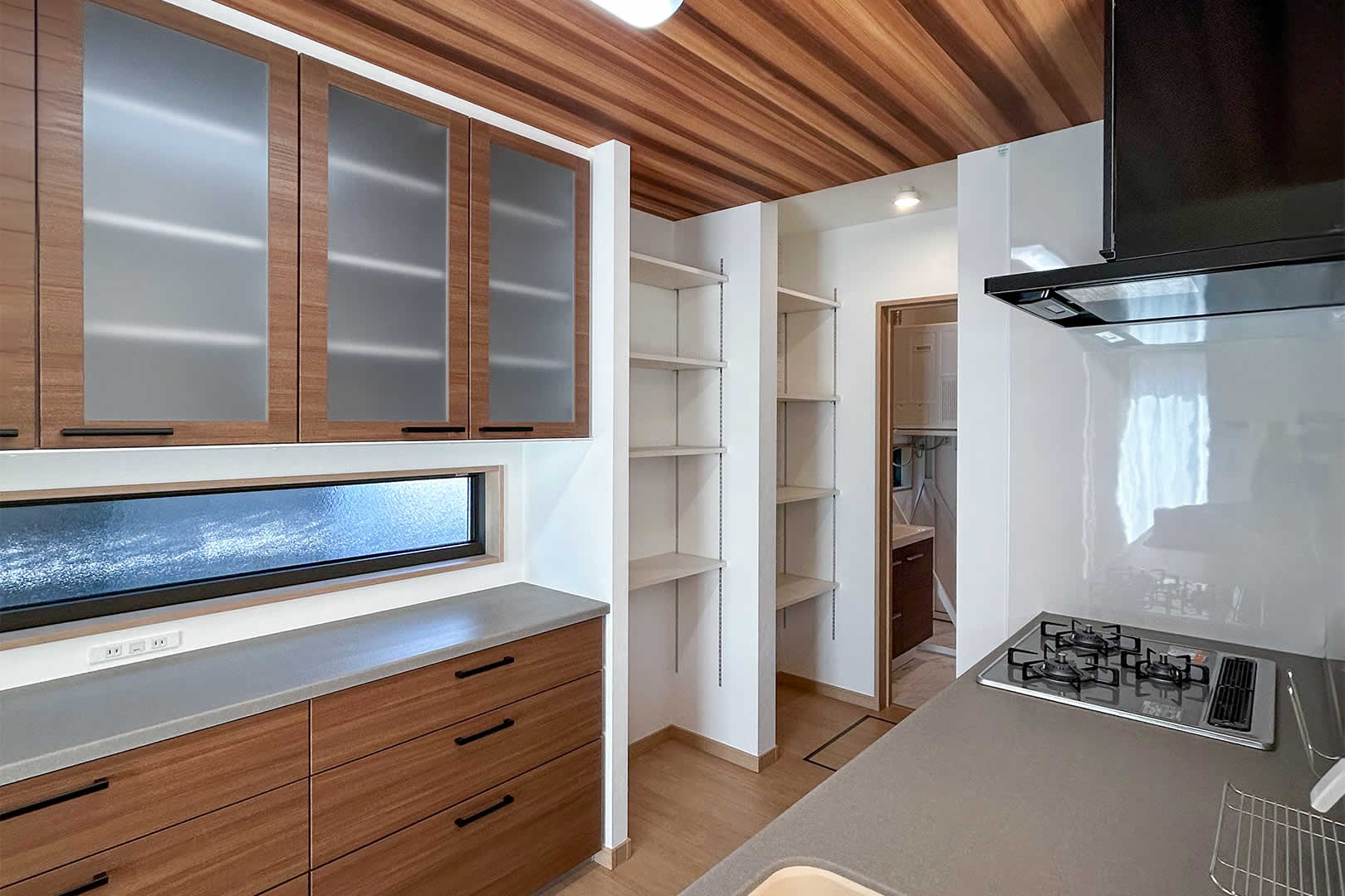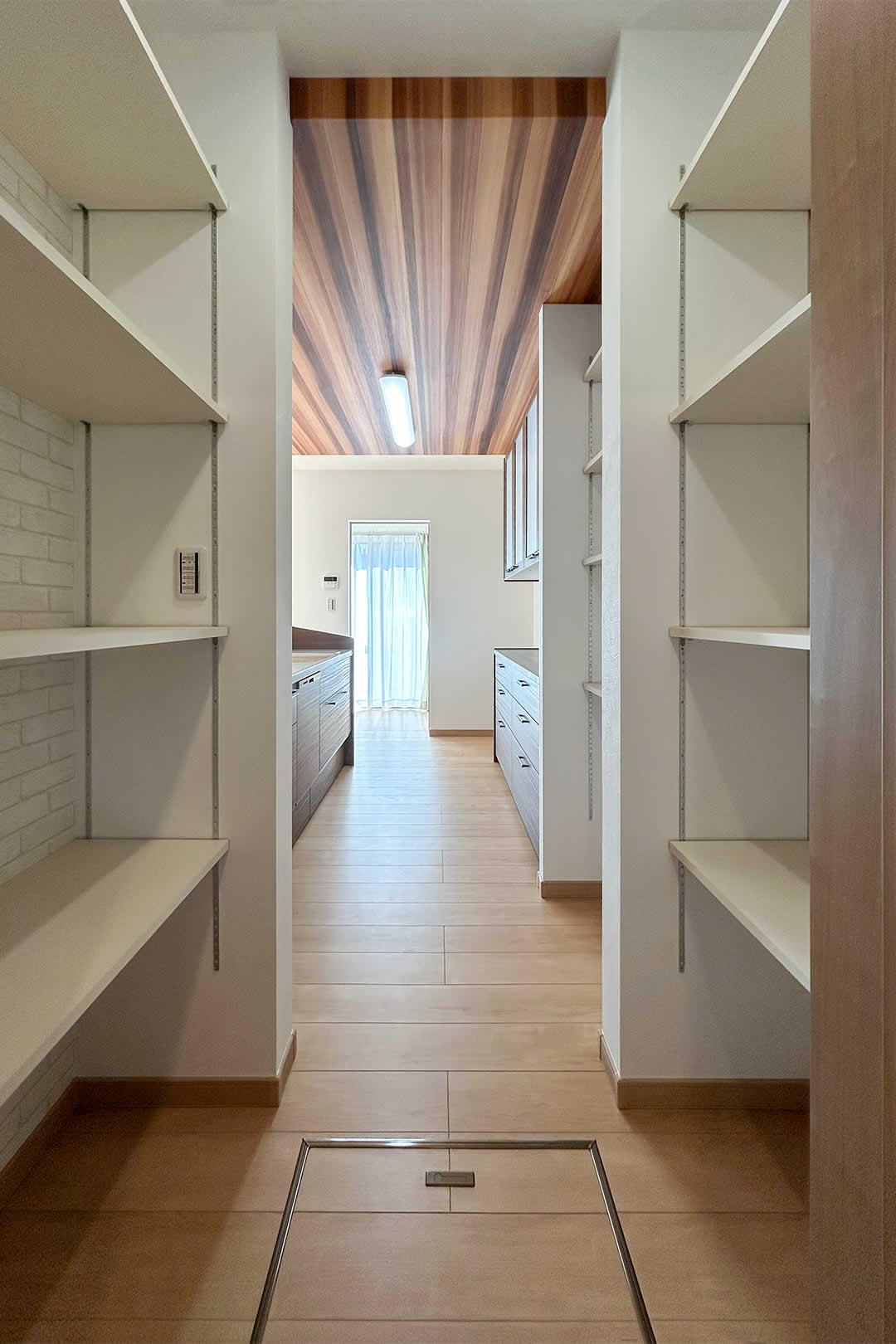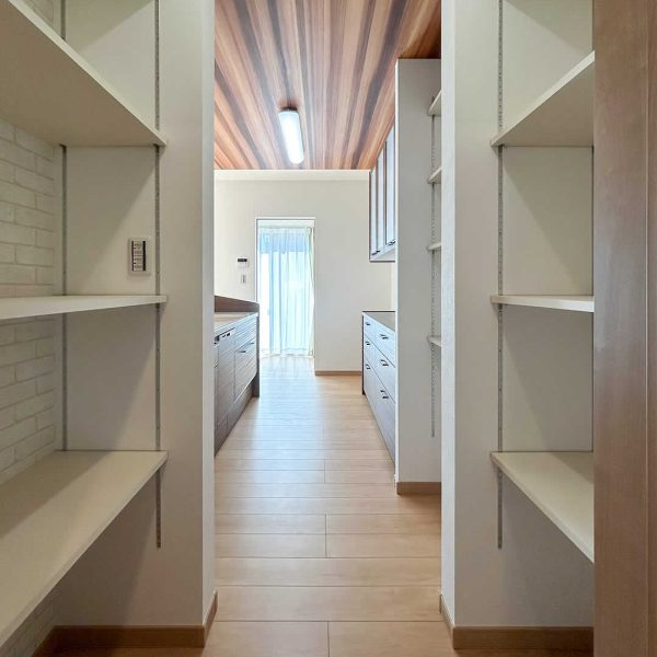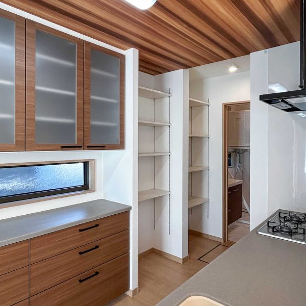 木目の天井が綺麗なキッチン大容量のパントリーは可動式の棚で家電やストック品も好きな高さに調節できるのがポイントです。