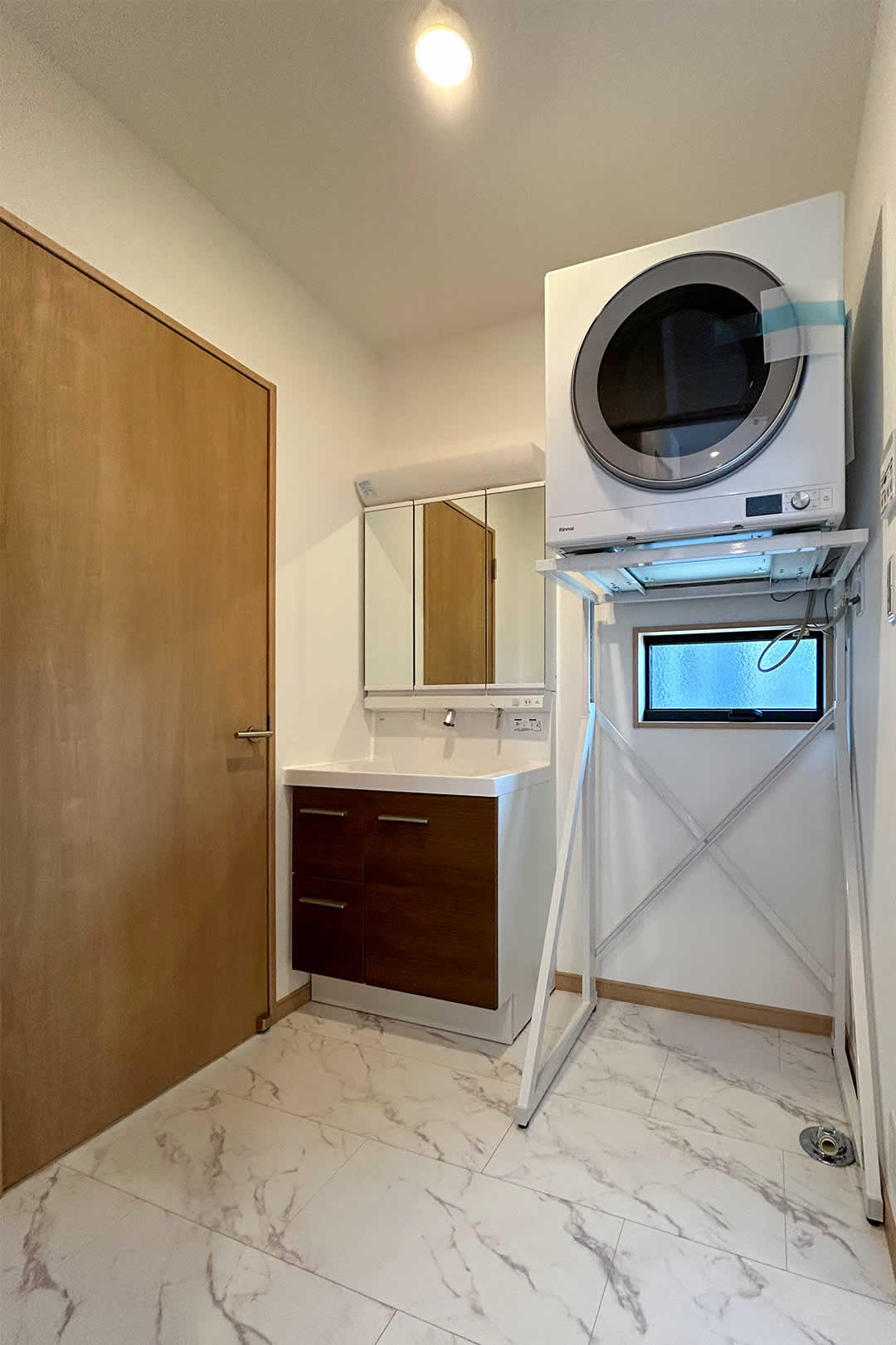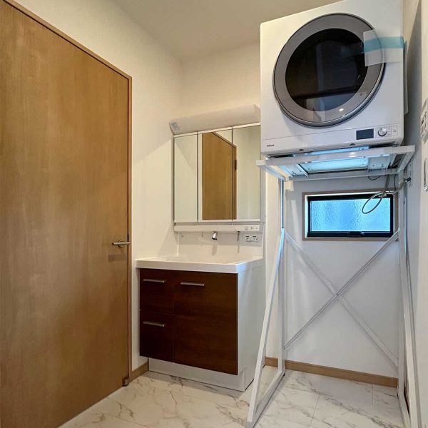 ガス乾燥機「幹太くん」を設置しています。洗濯の効率が良くなる人気の設備です。玄関→脱衣室→キッチンに抜けられる動線になっています。