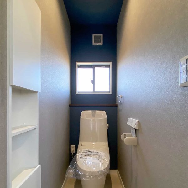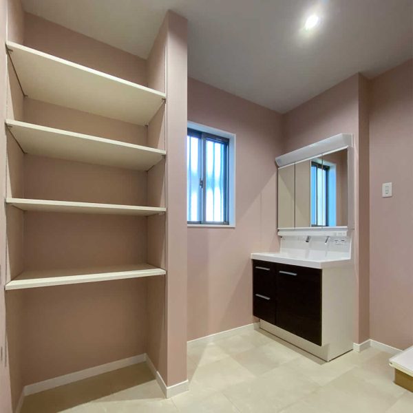 大きな可動式の棚が付いているのでストックやタオルなど物が多い方でもしっかり収納できます。ピンクのアクセントクロスが素敵です。