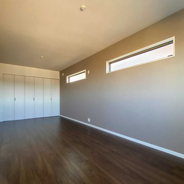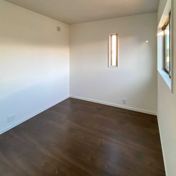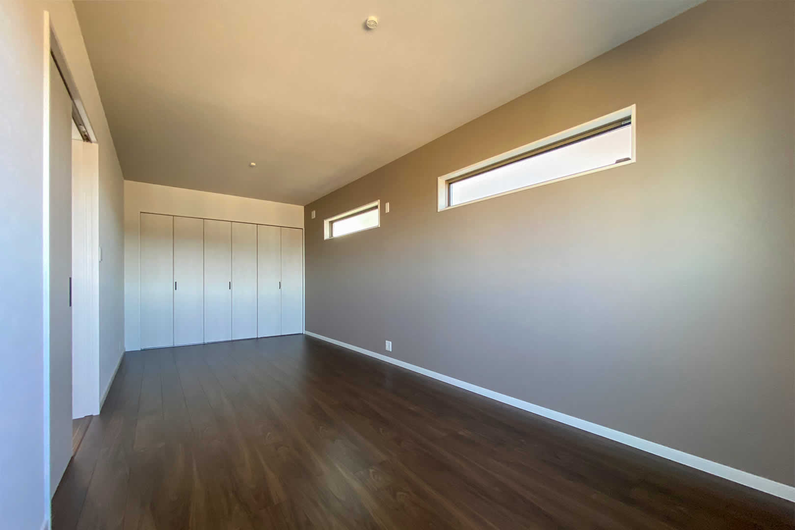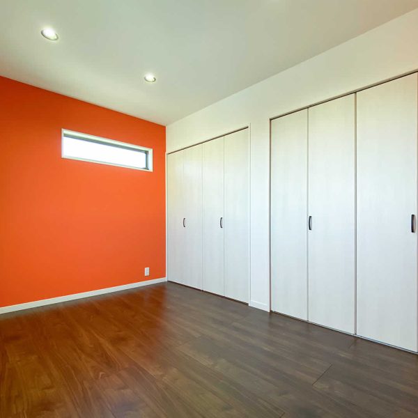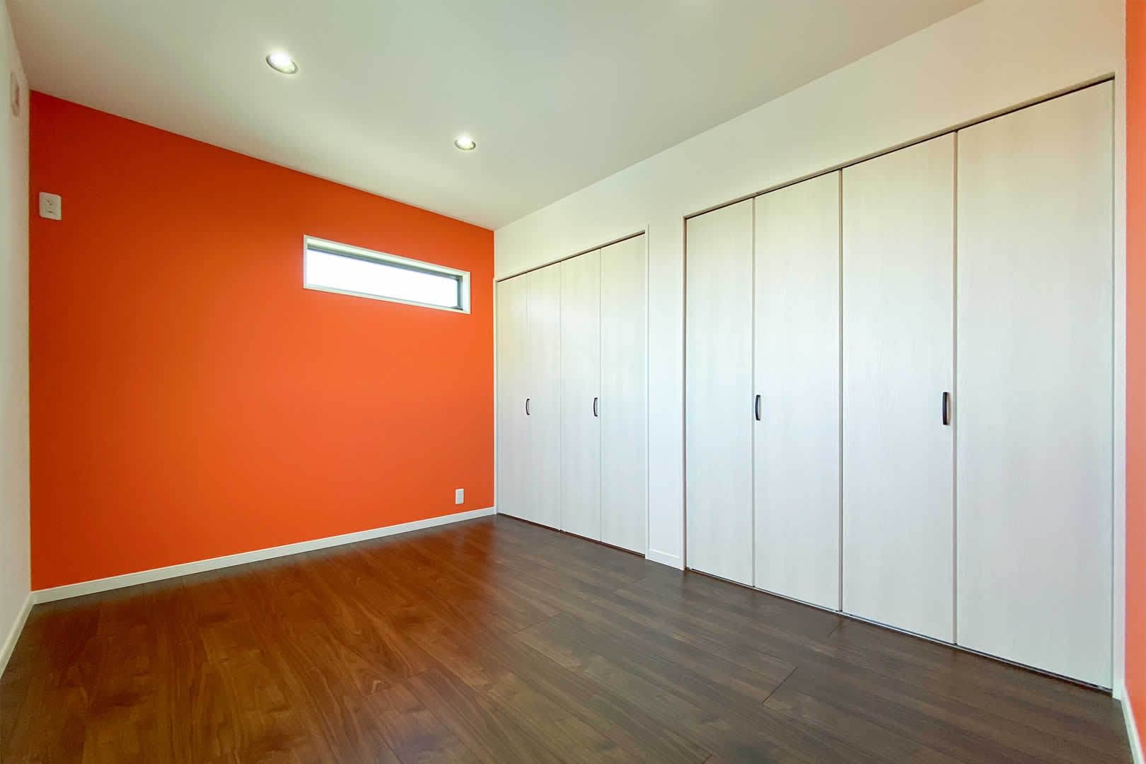 ご夫婦がこだわりで選ばれたオレンジの壁紙が映える主寝室。ご家族のお気に入りの空間を一から作れるのも注文住宅の良さです。
