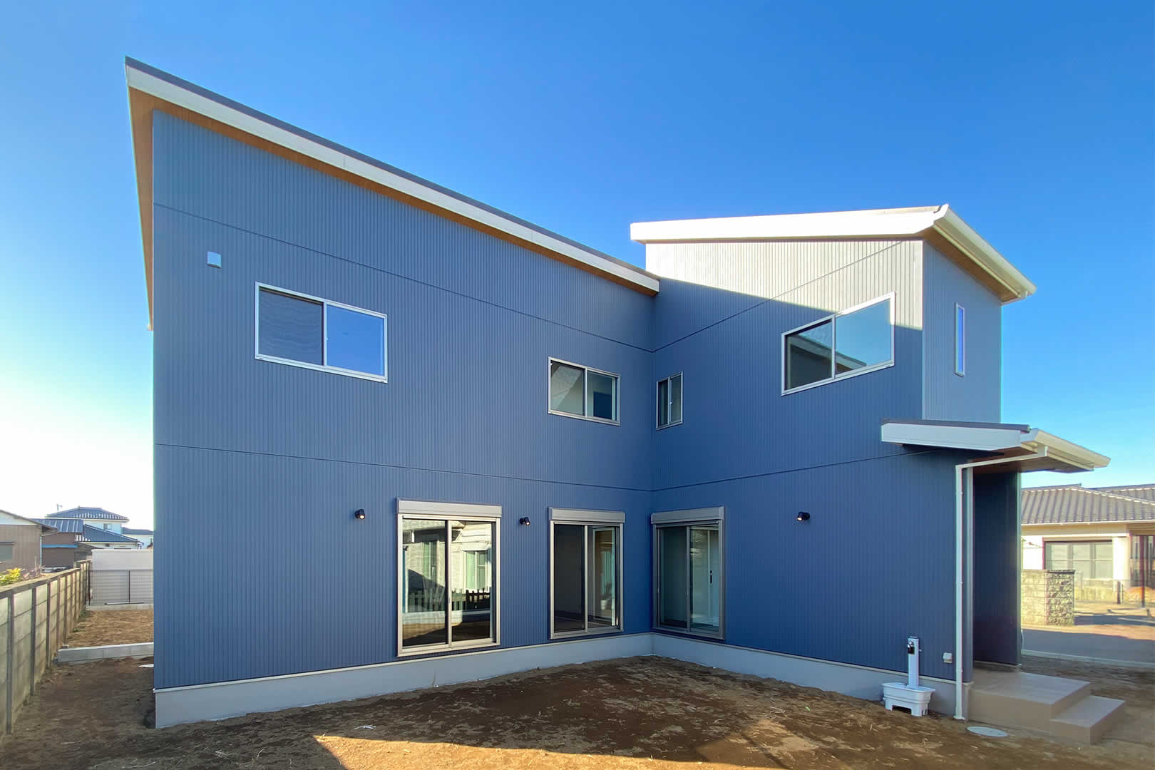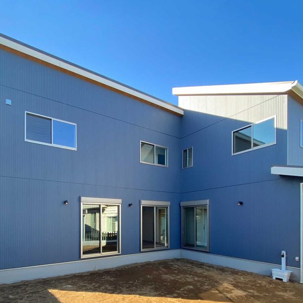 L字の建物に囲まれたプライベートスペース。お子さまの趣味のバスケものびのびとできる家族の憩いの場所を作りました。