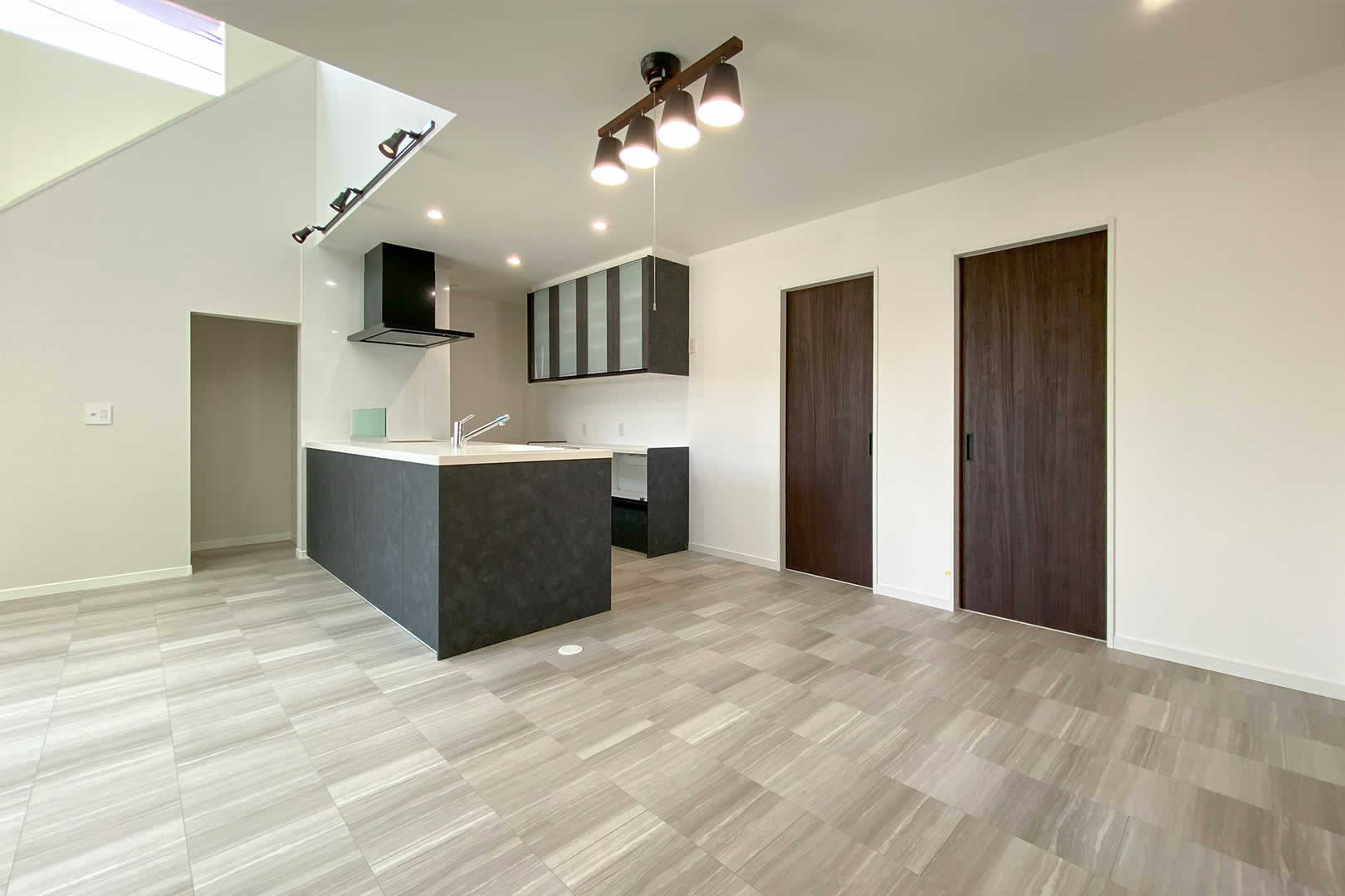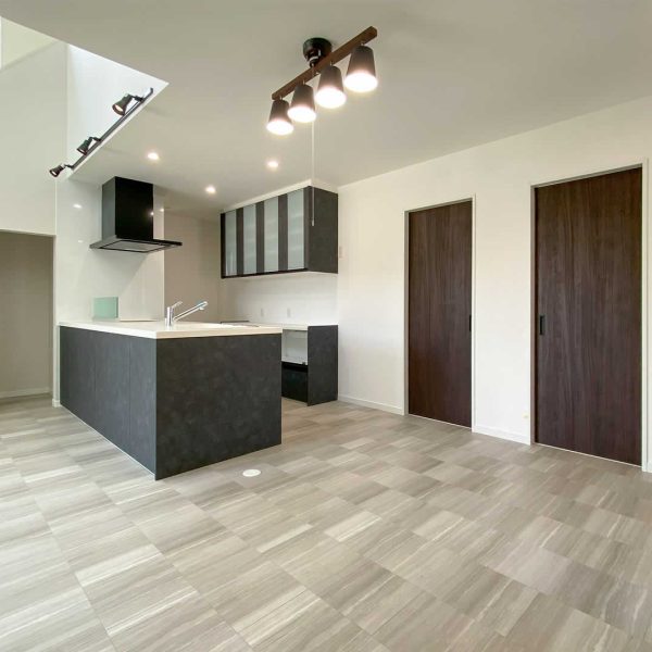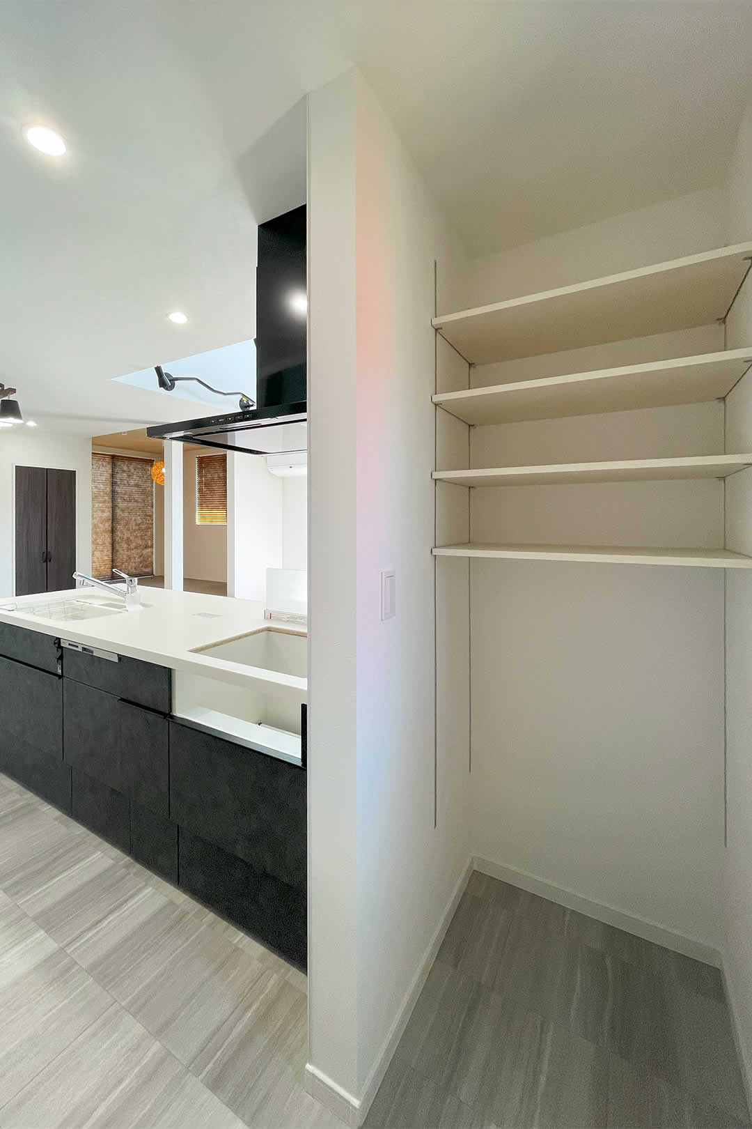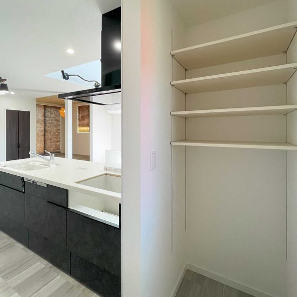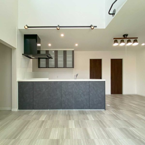 フルフラットのキッチンはスタイリッシュで作業スペースも広いです。リビング側は収納になっているので日用品もすっきり収納できます。