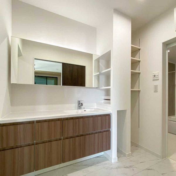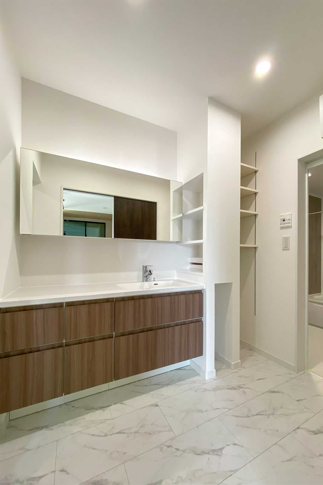 間接照明の入った造作洗面はペーパー置き場やゴミ箱スペースもあります。生活動線が考えられているので片付けがしやすいです。