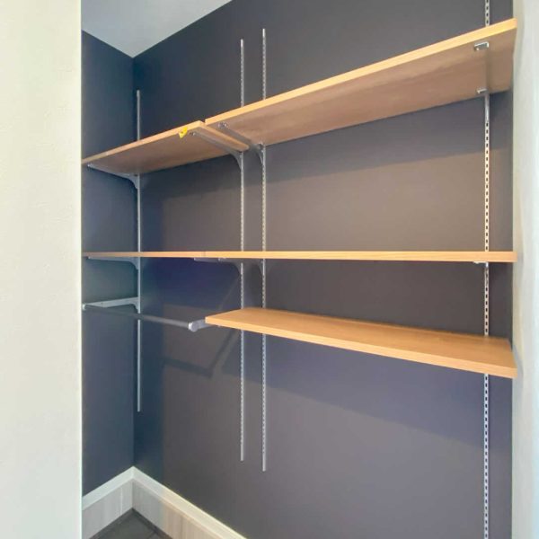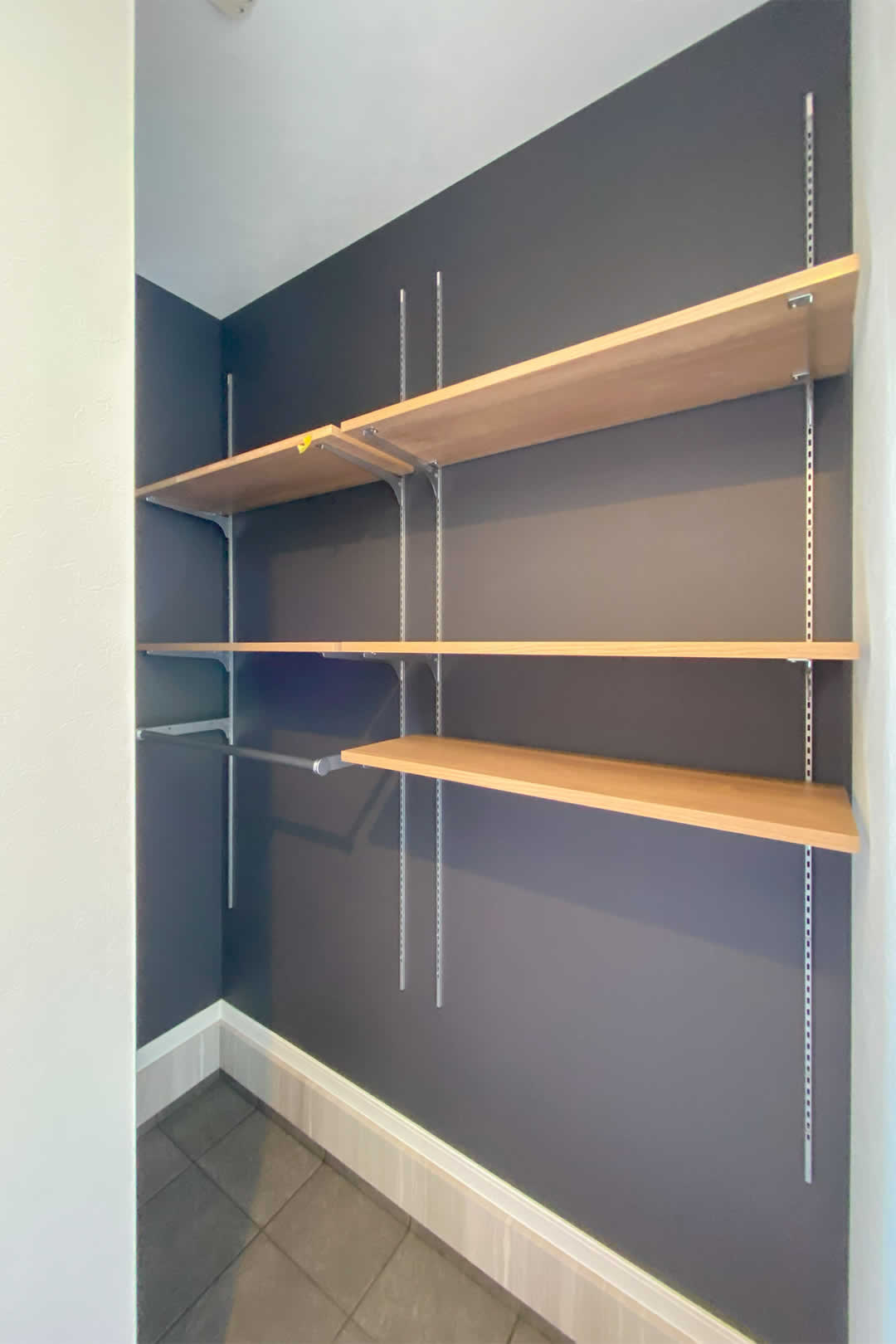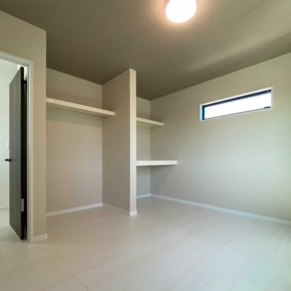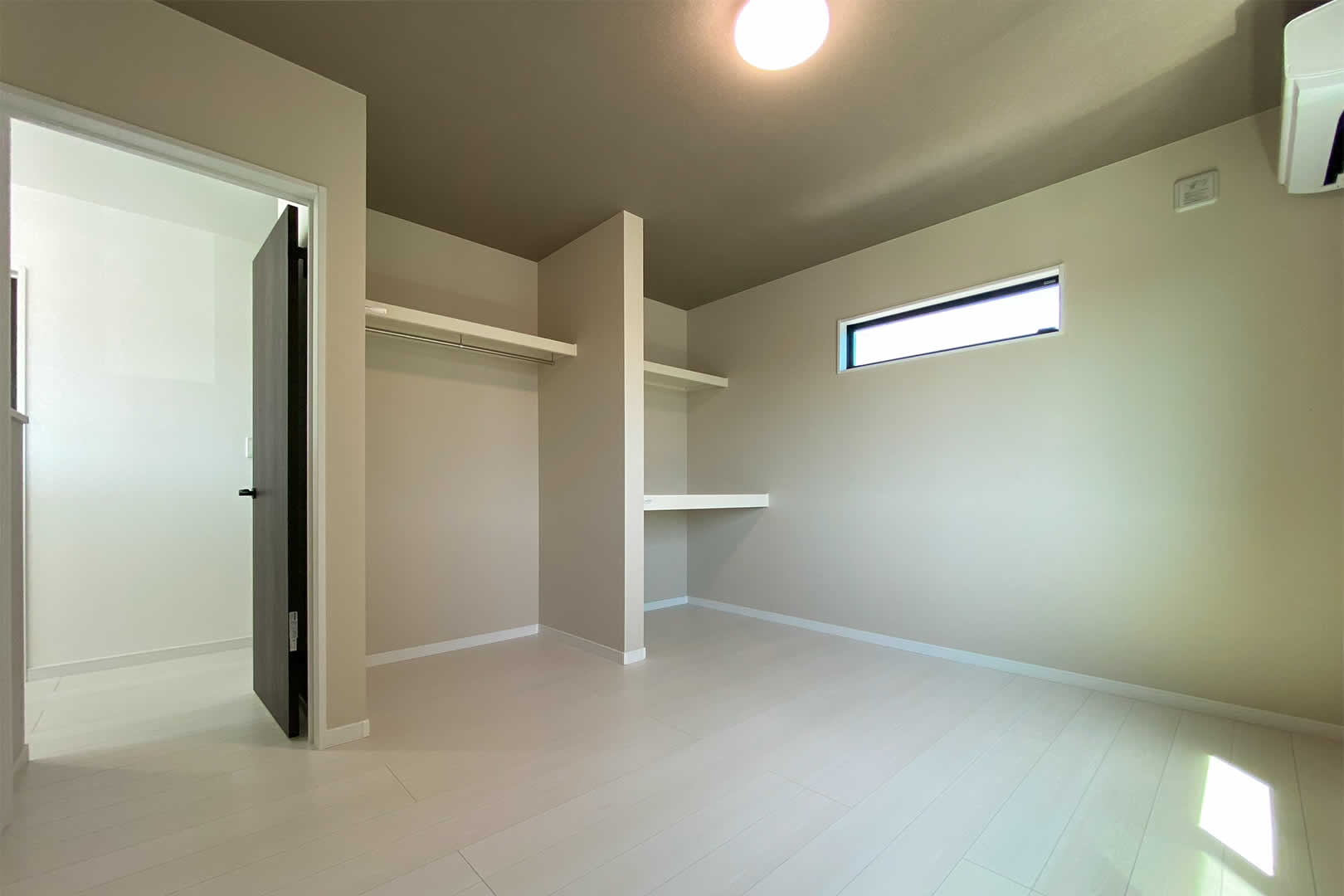 収納には建具を付けず圧迫感を減らしました。グレー調のクロスで落ち着きのある空間に。