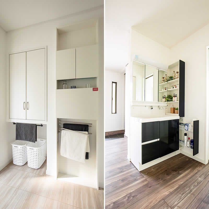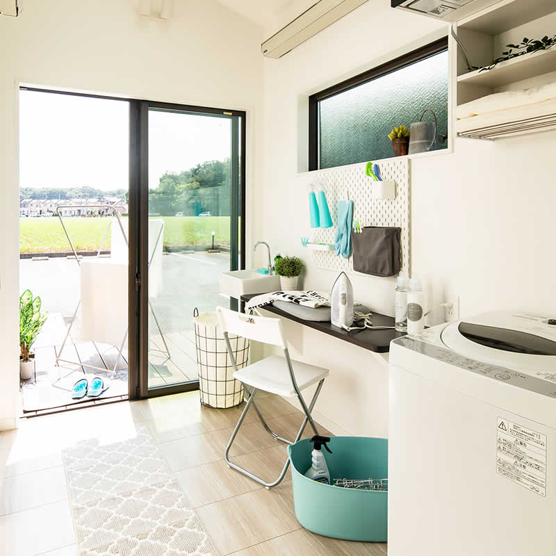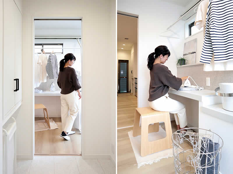 共働きの方など室内干しの割合が多いという声を多く頂きます。梅雨や花粉の時期など外に干せない時期にも大活躍します。物干し2本、カウンターもあるのでお洗濯の一連の作業がここでOK!