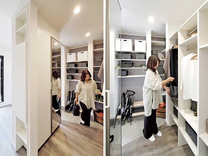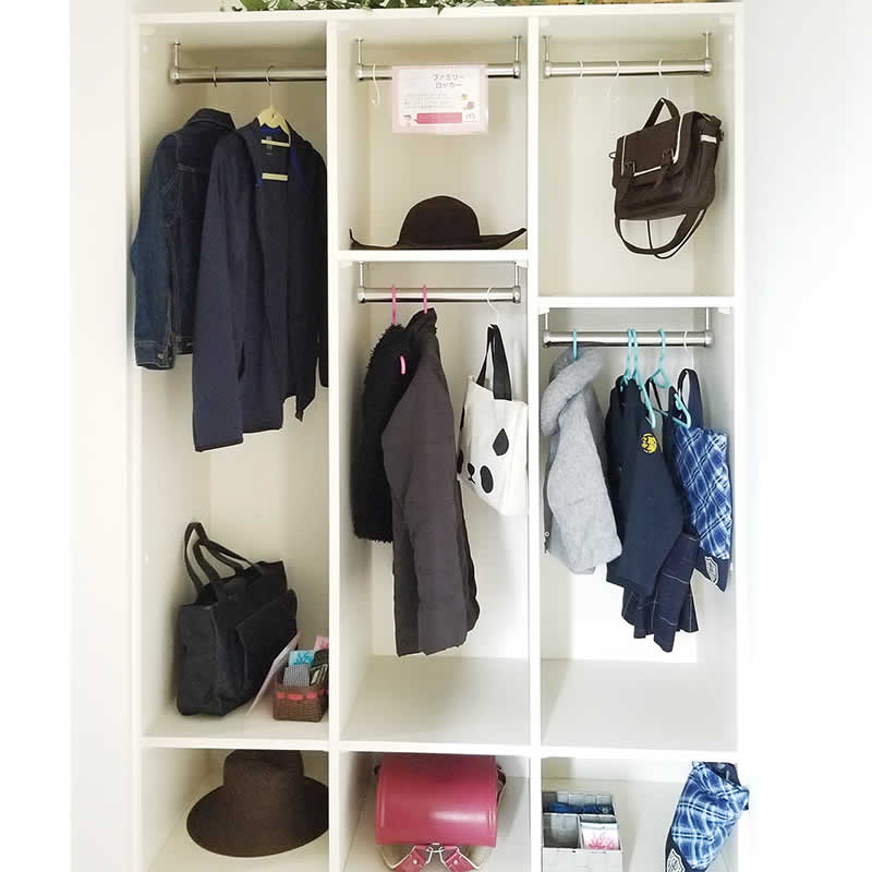 玄関にコートかけ、鞄置き場があるとリビングが散らからずにお家がスッキリしますね。来客の際は扉でサッと隠せます。