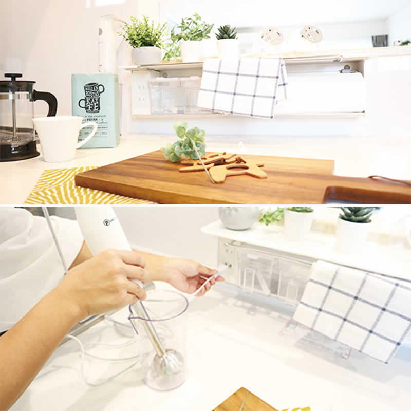 調味料やキッチンペーパーもしまえるLIXILの使いやすいキッチンは標準装備です。2口のコンセントがついていて料理の幅も広がります。