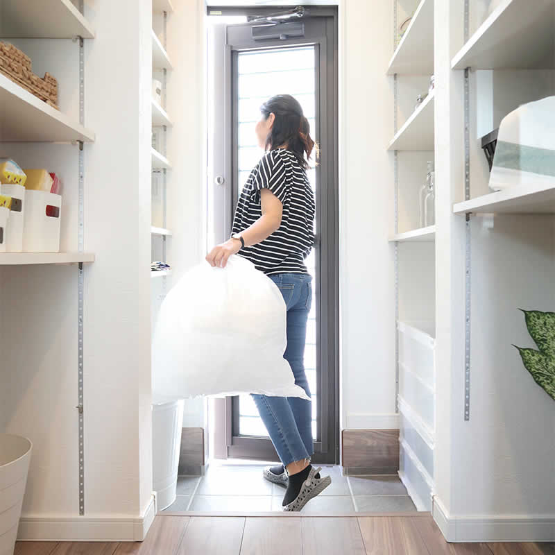 食品や調理器具も楽々置けちゃう広々パントリー。勝手口に続く土間収納は朝出すゴミの置き場にもなります。