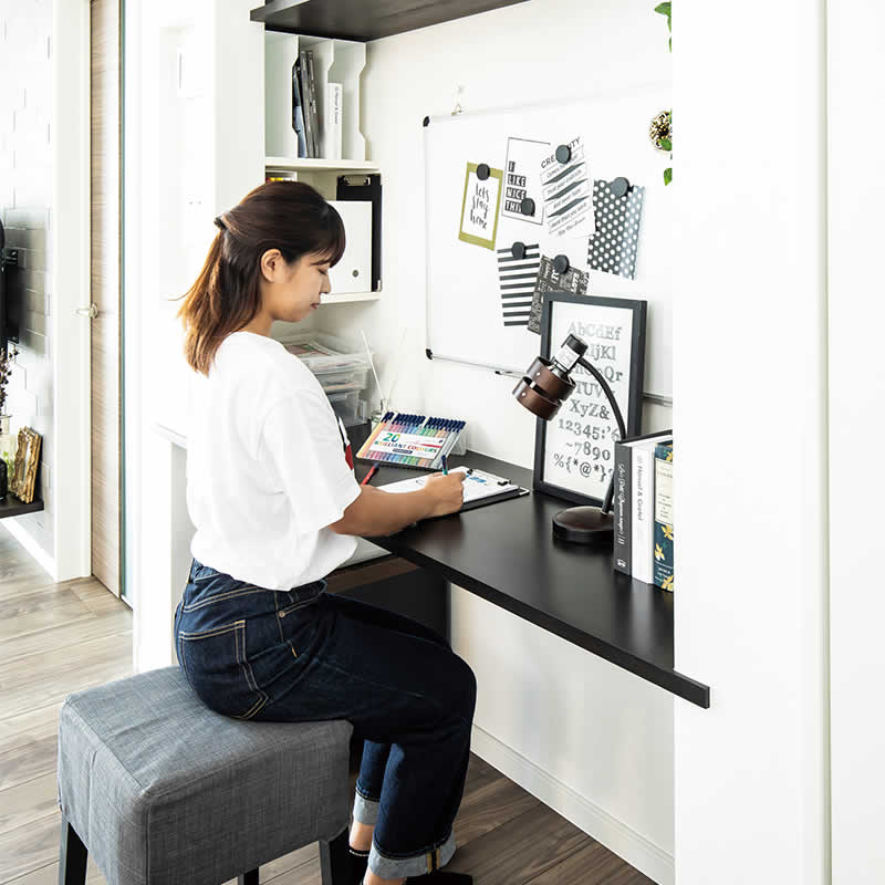 お便りを貼る、お子様の宿題をする、夜はママの作業スペースなど暮らしに合わせてアレンジできるスペースです。