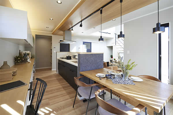 リビングダイニング 家族とのコミュニケーションが取りやすい縦長リピング。リピングの一角のスタディスペースはPC作業やお子様の宿題など家族で様々な用途に便用することができます。4
