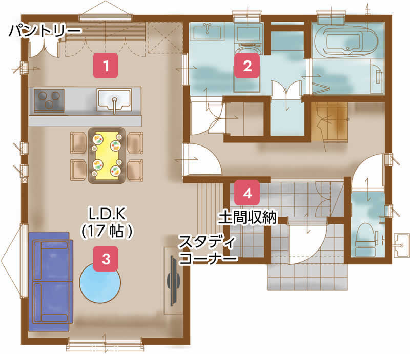 ランドリールーム キッチンのすぐ隣りの水まわりは洗濯動線もラクになり家事の負担が軽減されます。3