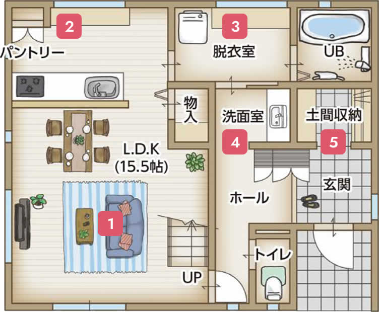 玄関手洗い 玄関ホールに手洗いスペースをつくることで帰宅後すぐに手を洗えます。5